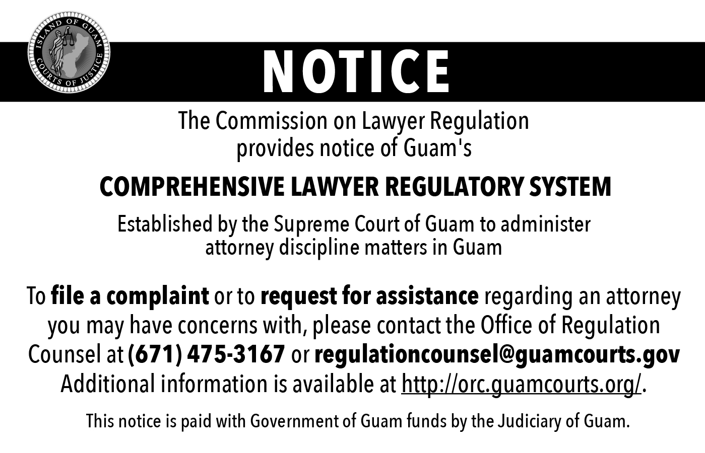 - Commission on Lawyer Regulation Publication Nos. 1 and 2 (Pacific Daily News, April 20, 2022; Guam Daily Post, September 8, 2022) regarding the establishment and operations of the Comprehensive Lawyer Regulatory System and its components under the Guam Rules for Lawyer Disciplinary Enforcement and Disability Proceedings